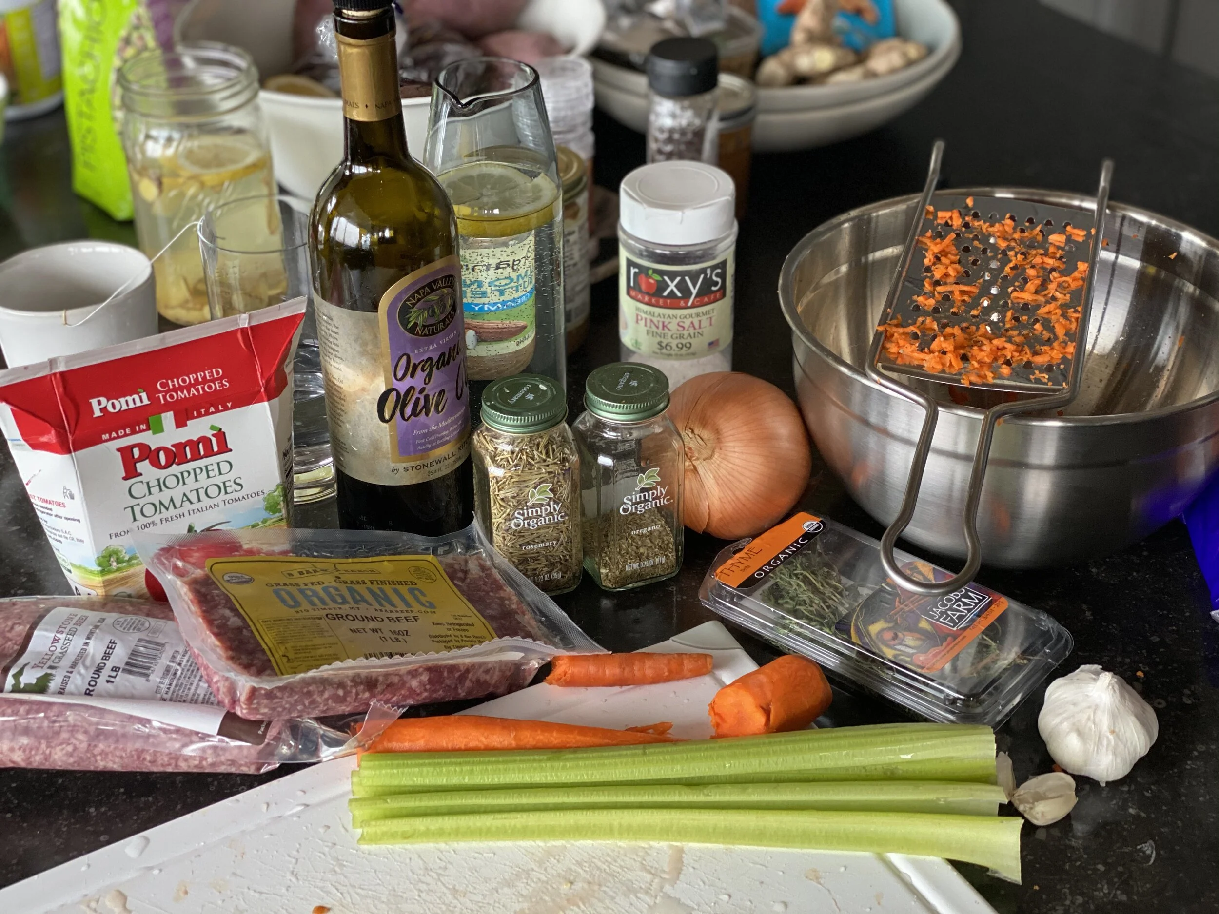 In a large bowl, combine turkey, carrots, celery, onion, garlic, olive oil, herbs, salt and pepper. Mix thoroughly, so the ingredients are combined. Roll into balls and place on a large skillet, add 1 can of crushed tomatoes, garlic, herbs, salt.